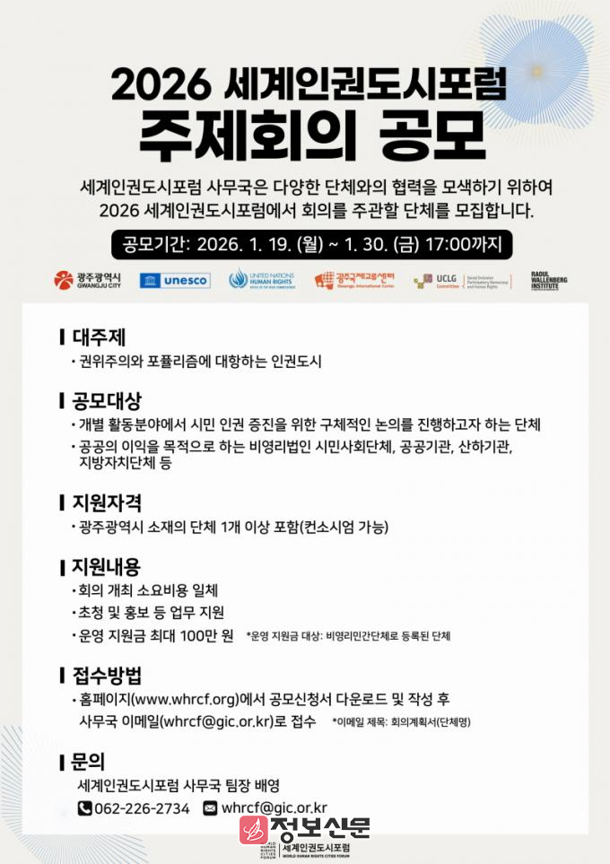 ![]() 광주광역시, ‘세계인권도시포럼’ 주제회의 주관단체 공개 모집 |
