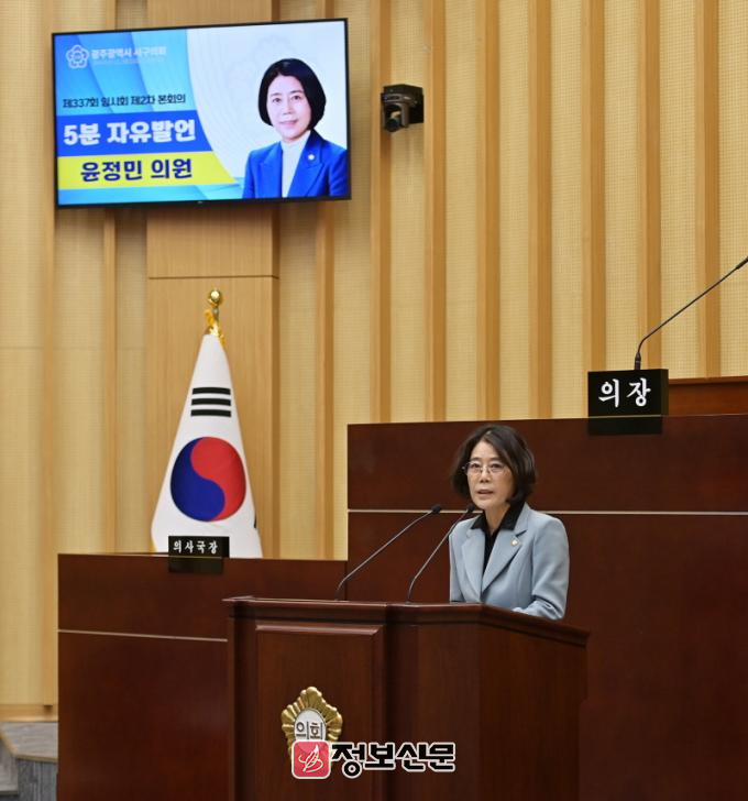 윤정민 서구의원(더불어민주당)은 지난 23일 열린 제337회 임시회 제2차 본회의 5분자유발언에서“공공형 실내놀이터 공모사업 선정을 위해 애써온 집행부의 노력에 감사드린다”며 “이번 사업이 일회성 시설 조성에 그치지 않고 공공돌봄의 주요 정책으로 자리매김해야 한다”고 강조했다.