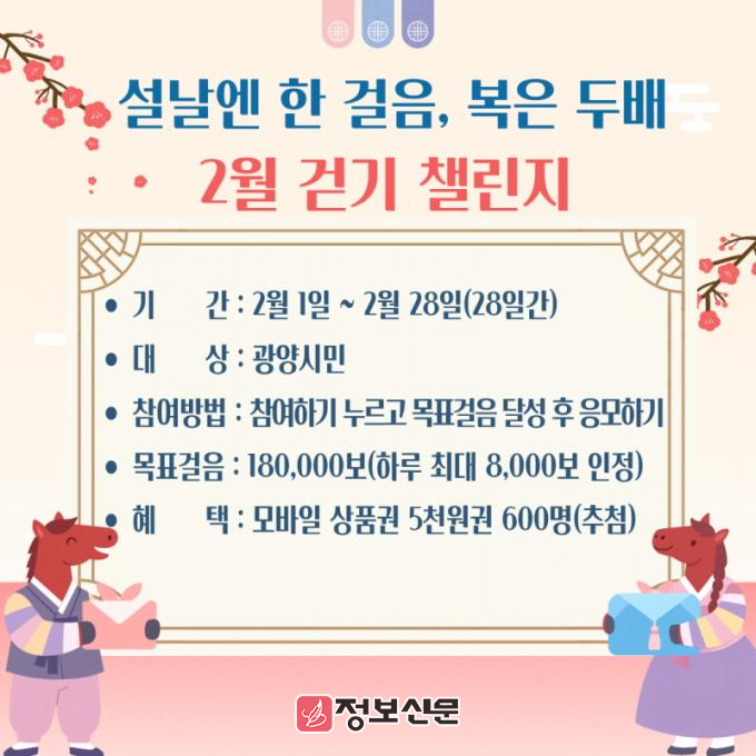 ![]() 광양시, 워크온 ‘설날엔 한 걸음, 복은 두 배! 2월 걷기 챌린지’ 운영 |