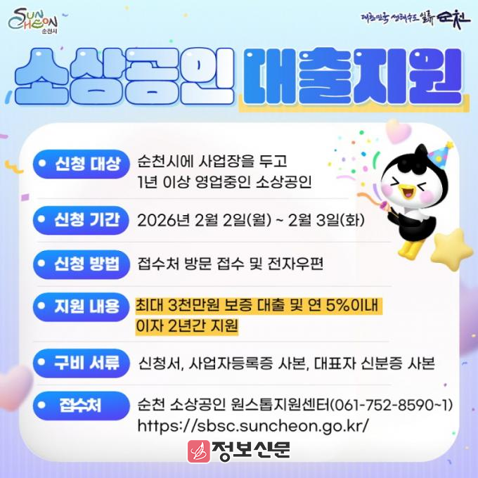 ![]() 순천시, 소상공인 금융지원 1분기 신청 접수 시작 |