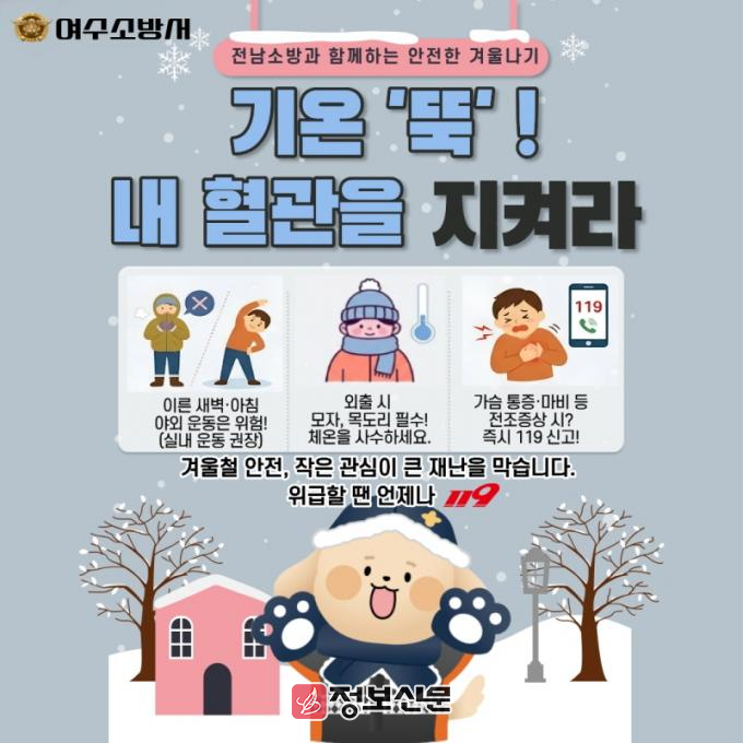 여수소방서는 시민들이 쉽게 이해하고 실천할 수 있도록 카드뉴스를 제작해 배포하며, 이른 새벽과 아침 시간대의 무리한 야외활동을 자제할 것을 당부했다. 또한 외출 시에는 모자와 목도리를 착용해 체온 유지를 철저히 하고, 가슴 통증이나 마비 증상 등 전조 증상이 나타날 경우 즉시 119에 신고해 신속한 응급처치를 받을 것을 강조했다.