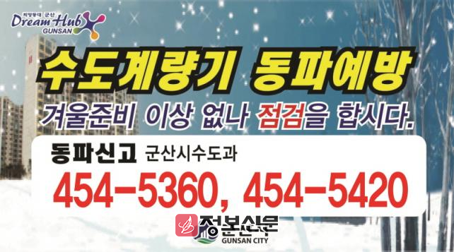 한편, 동파로 인한 계량기 교체가 필요할 경우 군산시청 수도과(☎063-454-5360, 5420)로 신고하면 된다.