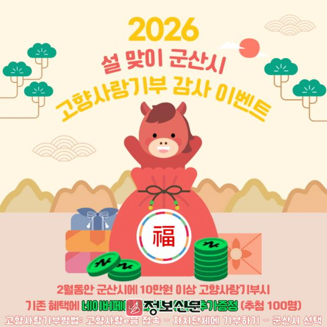 이번 행사는 설 연휴 기간을 포함해 2월 1일부터 28일까지 진행되며, 군산시에 10만 원 이상 고향사랑기부에 참여하면 자동으로 응모된다. 참여자 중 무작위 추첨을 통해 선정된 100명에게는 1만 원 상당의 ‘네이버페이 포인트’ 모바일 쿠폰을 추가로 증정하며, 당첨자는 3월 중 개별 문자를 통해 안내할 예정이다.