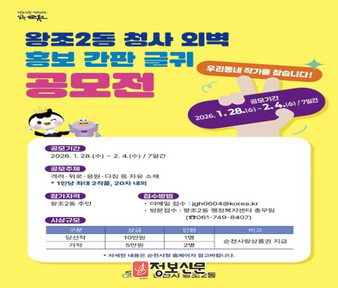 ![]() 순천시 왕조2동, 청사 외벽 홍보 간판 글귀 공모전 시행 |