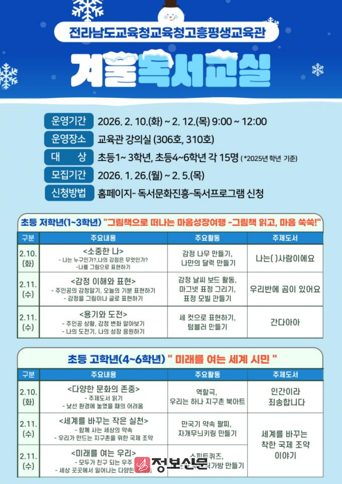 ![]() 고흥교육지원청 평생교육관, ‘겨울 독서교실’ 운영 |