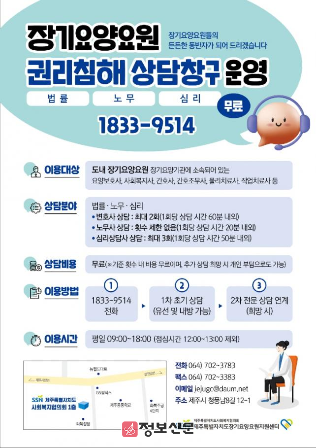 ![]() 제주특별자치도, 도 단위 최초 장기요양요원 고충상담콜‘시시콜콜’운영 |