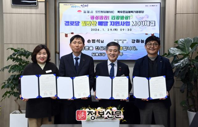 이번 협약은 지역 내 어르신들의 건강한 식생활 지원과 안정적인 돌봄 체계 구축을 위해 마련됐으며, 도드람김제FMC와 목우촌 김제육가공공장이 협력기관으로 참여했다.
