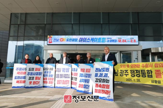 이날 간담회는 전남도의회 주관으로 도·시·군의원 300여 명을 대상으로 행정통합에 대한 의견을 수렴하기 위해 마련됐다. 그러나 무안군의회는 일방적인 졸속 추진 과정에 대한 우려를 표명하며 간담회장 앞에서 피켓 시위에 나섰다.