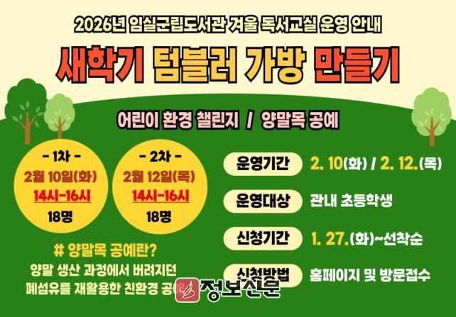 심민 임실군수는 “이번 겨울 독서교실이 어린이들에게 환경과 독서를 함께 생각하는 계기가 되기를 바란다”며 “앞으로도 도서관을 중심으로 한 다양한 어린이 독서문화 프로그램을 지속적으로 운영하겠다”고 말했다.