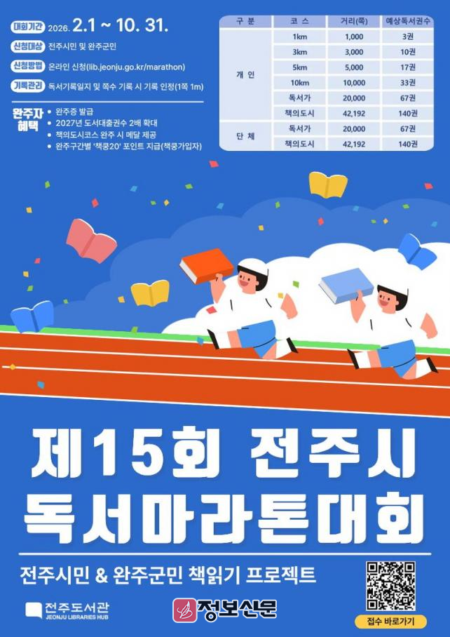 한편, 제15회 전주시 독서마라톤 대회는 오는 2월 1일부터 전주도서관 누리집(lib.jeonju.go.kr/marathon)을 통해 신청할 수 있으며, 기타 자세한 사항은 전화(063-230-1811)로 문의하면 된다.