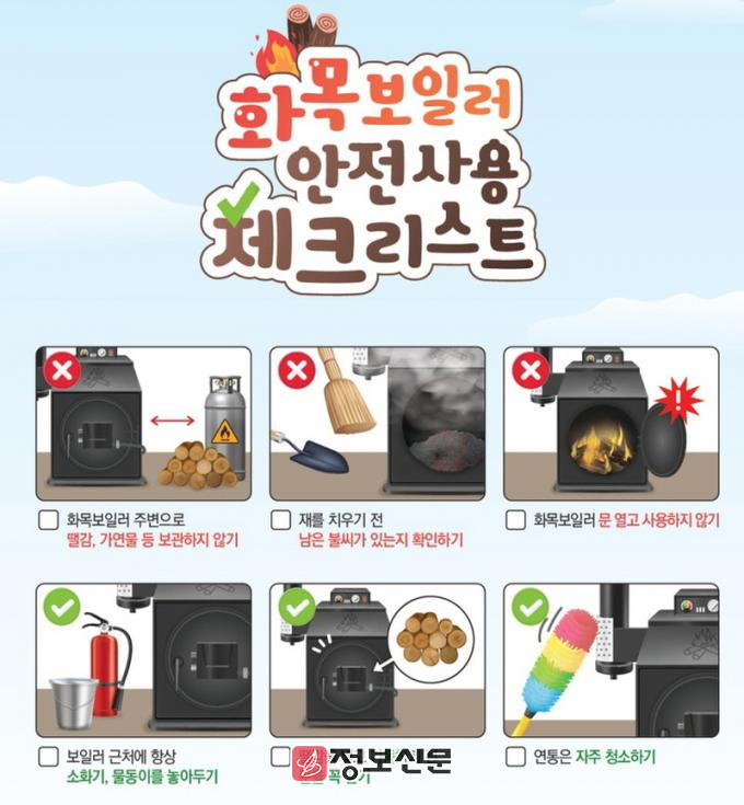 주요 내용은 ▲화목보일러 주변에 땔감 및 가연물 보관 금지 ▲연통 내부 그을음 정기적 청소 ▲보일러 고정 설치로 넘어짐 방지 ▲불씨 제거 후 재 투입 ▲사용 중 보일러 문 개방 금지 ▲소화기와 물통을 항상 비치하는 것이다.