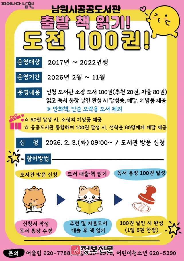 ![]() 남원시공공도서관, 2026년 ‘출발 책 읽기 도전 100권’ 운영 |