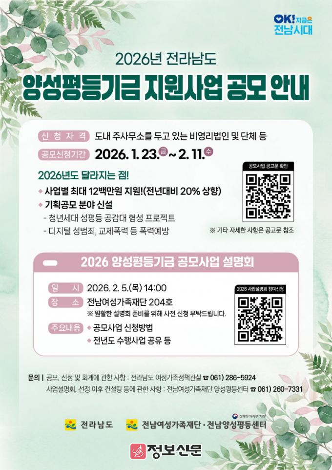 ![]() 전남여성가족재단, 2026년 전라남도 양성평등기금 공모사업 설명회 개최 |