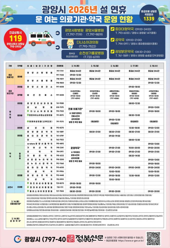 이와 함께 상·하수도 및 안전 관련 민원도 전문업체와 협력해 원활히 처리하며, 병·의원 및 약국 운영 일정과 생활민원 관련 정보는 광양시 누리집을 통해 안내할 방침이다.