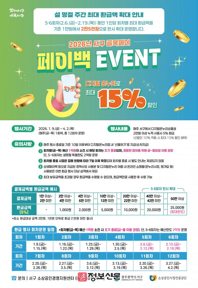 김이강 서구청장은 “명절을 앞두고 소상공인과 주민 모두에게 실질적인 도움이 되도록 페이백 혜택을 대폭 확대했다”며 “골목상권에는 힘이 되고 주민들에게는 풍성한 설 선물이 되는 ‘착한 경제도시 서구’를 만들기 위해 최선을 다하겠다”고 말했다.
