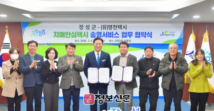 군은 4일 군청 상황실에서 (유)영천택시와 ‘치매안심택시 송영 서비스’ 운영을 위한 업무 협약을 체결했다. 김한종 장성군수, 정귀우 (유)영천택시 대표 등 관계자 10여 명이 참석했다.