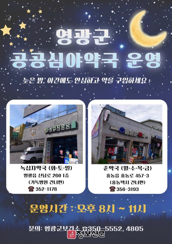 이번에 지정된 공공심야약국은 요일별로 운영되며, ▲녹십자약국은 화·토·일요일(영광읍 신남로 260 1층, ☎352-1178), ▲준약국은 월·수·목·금요일(홍농읍 홍농로 457-3, ☎356-3193)에 운영된다.