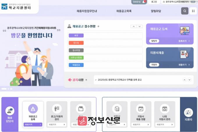 광주서부교육지원청은 각 학교의 ▲채용 공고 ▲서류 접수 및 심사 ▲합격자 서류 학교 이송 등을 지원해 원활한 채용이 이뤄지고 인사행정의 공정성도 확보할 계획이다. 단 면접전형과 최종합격자 통보는 학교에서 진행한다.