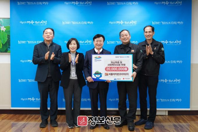 ![]() ▲ 여수시는 지난 3일 비를라카본코리아㈜(공장장 이태정)가 관내 저소득 가구와 사회복시시설을 위해 성금 2천만 원을 기탁했다