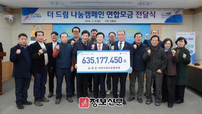![]() ▲ 여수시 27개 읍면동 지역사회보장협의체(위원장 대표 김만곤)는 지난 6일 시청 상황실에서 지난해 모금한 6억 3천5백만 원 연합모금액 후원증서를 여수시에 전달했다.