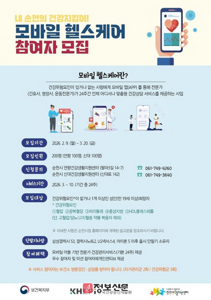 ![]() 순천시, 2026년 ‘보건소 모바일 헬스케어’ 사업 참여자 모집 |