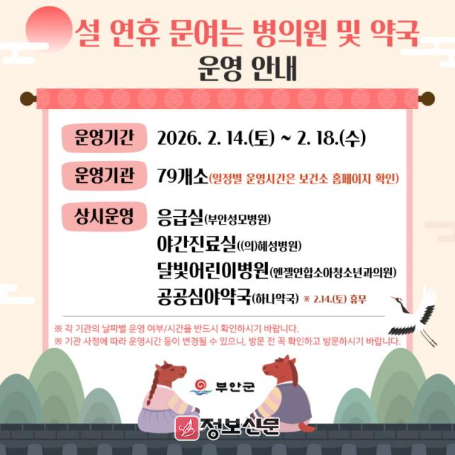특히, 지역응급의료기관인 부안성모병원은 24시간 응급실을 운영할 계획이며, 혜성병원은 야간진료실(09:00~17:00)을, 엔젤연합소아청소년과의원은 달빛어린이병원(10:00~18:00)으로 운영하며, 부안군보건소는 2. 17.(화) 설날 당일에 진료를 실시할 예정이다