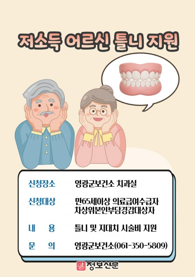 ![]() 영광군, 저소득 어르신 틀니 시술비 지원 사업 추진 |