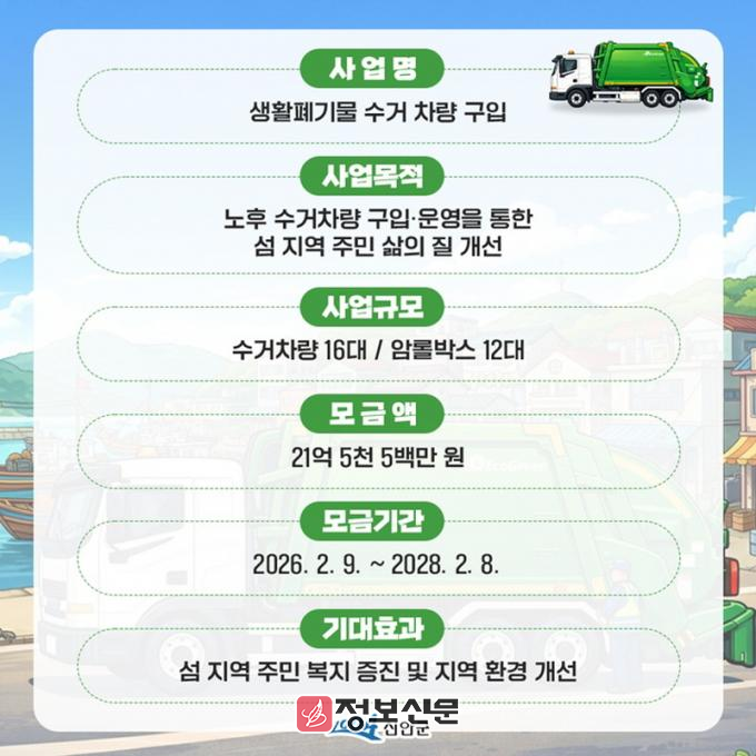 이에 신안군은 노후 차량으로 인한 안전 문제와 환경 저해 요소를 해소하고, 생활폐기물 수거의 효율성을 높이기 위해 단계적인 차량 교체가 필요하다고 판단해 재원 마련 방안으로 고향사랑 지정기부사업을 추진하게 됐다.