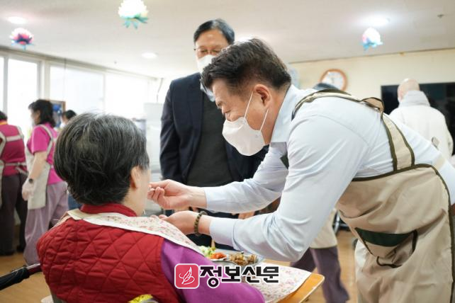 오 지사는 입소 어르신 식사 시간에 직접 배식과 식사 보조에 참여해 돌봄 현장도 체험했다.