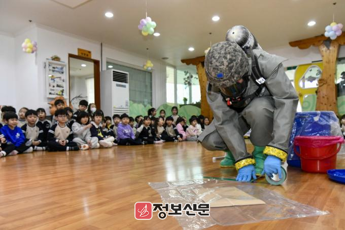현장 조치 후에는 유치원생 대상 화생방 장비 소개 및 시연이 이어졌다. 요원들은 아이들의 눈높이에 맞춰 방독면, 보호의 등 장비의 역할을 쉽게 설명하며 화생방 훈련이 생명을 보호하는 중요한 활동임을 강조했다. 특히 희망 아동을 대상으로 방독면·보호의 착용 체험을 진행해, 훈련을 보다 친숙하게 느낄 수 있도록 했다.