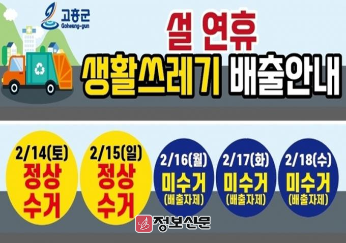 고흥군은 2월 14일(토)부터 15일(일)까지는 설 명절에 발생한 생활폐기물을 정상 수거하며, 이 기간 환경미화원 등 약 100명을 투입해 평소와 같이 안정적인 수거 서비스를 제공할 계획이다.