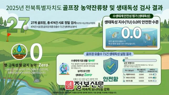 전경식 전북자치도 보건환경연구원장은 “과학적인 검사를 통해 도내 골프장과 주변 환경의 안전성을 지속적으로 확인하고 있다”며 “앞으로도 친환경 생활체육시설 환경 조성을 위해 선제적인 관리체계를 강화해 나가겠다”고 말했다.
