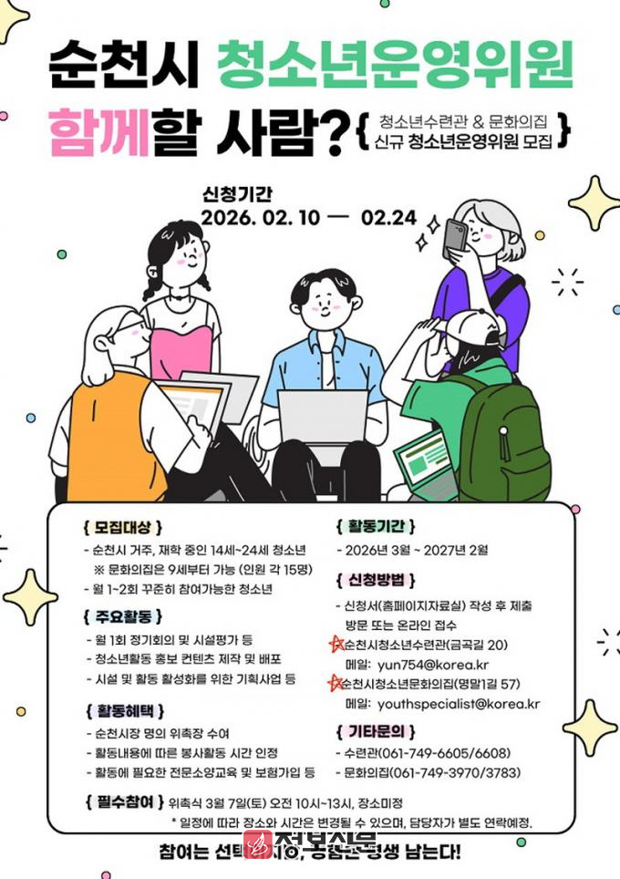모집은 2월 24일까지 순천시에 거주하거나 관내 재학 중인 9세~24세 청소년을 대상으로 하며, 자세한 사항은 각 시설 누리집 및 순천시청소년수련관(061-749-6605) 또는 문화의 집(061-749-3970)을 통해 안내받을 수 있다.