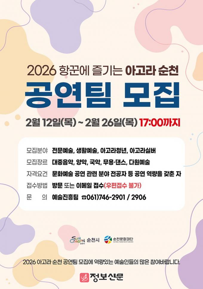 ![]() (재)순천문화재단, ‘2026 항꾼에 즐기는 아고라 순천’ 문화예술 공연팀 모집 |