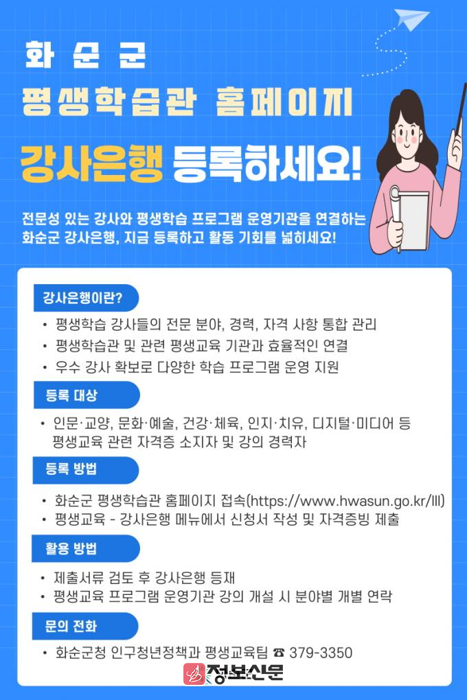 ‘강사은행’ 등록과 관련한 자세한 사항은 화순군청 인구청년정책과 평생교육팀(☎ 379-3350)으로 문의하면 된다.