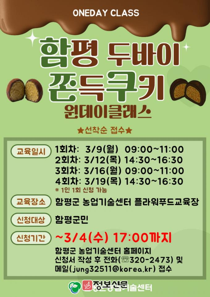 ![]() 함평군, ‘두바이 쫀득쿠키 만들기 원데이 클래스’ 교육생 모집 |