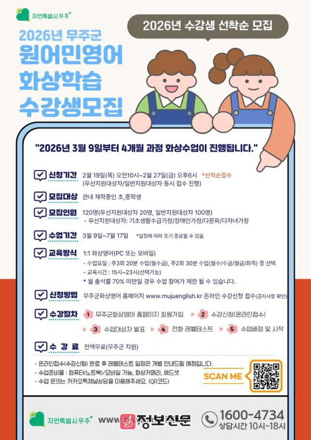 사업 신청은 ‘무주군 화상영어 누리집(www.mujuenglish.kr)을 통해 온라인 접수하며, 선정된 학생은 오는 3월부터 7월까지 4개월간 주 2~3회, 회당 20~30분의 맞춤형 1:1 원어민 화상영어 수업을 컴퓨터 또는 모바일로 수강할 수 있다.
