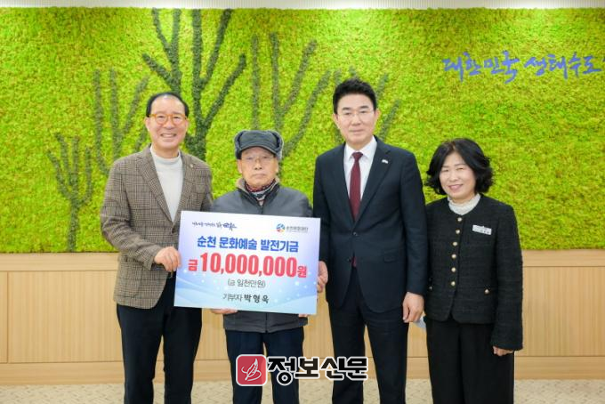 ![]() 13일 조례동에 거주하는 박형욱 씨가 지역 문화예술 발전을 위해 (재)순천문화재단에 1천만원을 기부한 뒤 기념촬영을 하고 있다 (좌측부터 (재)순천문화재단 상임이사 김병준, 기부자 박형욱, 순천시장 노관규, 순천시 문화관광국장 양효정)