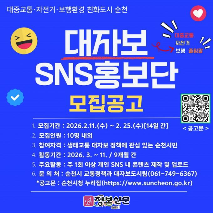 ![]() 순천시, 2026년 대자보 SNS 홍보단 모집 |
