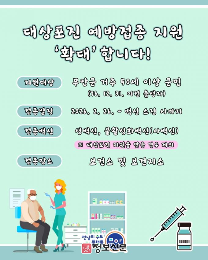 ![]() 무안군, 50세 이상 대상포진 예방접종 지원 확대 |