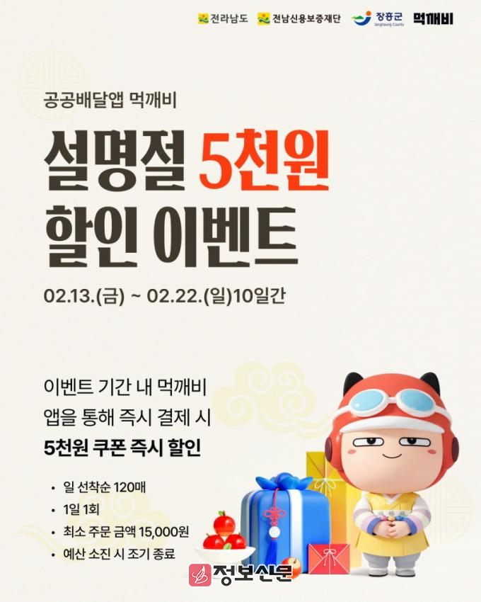 ![]() 장흥군, 설 맞이 공공배달앱 ‘먹깨비’ 할인 이벤트 추진 |