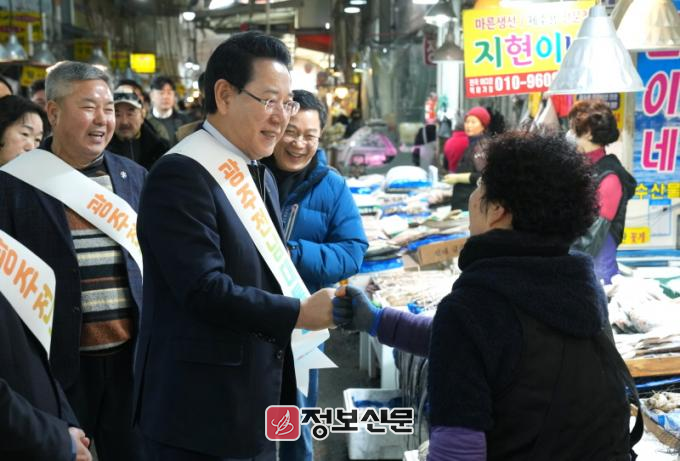 ![]() 김영록 전라남도지사가 설 명절을 앞둔 15일 지역 전통시장인 광주 양동시장을 방문해 전남·광주 행정통합의 취지와 추진 방향을 설명하고 물품을 구매하며 상인들을 격려하고 있다.