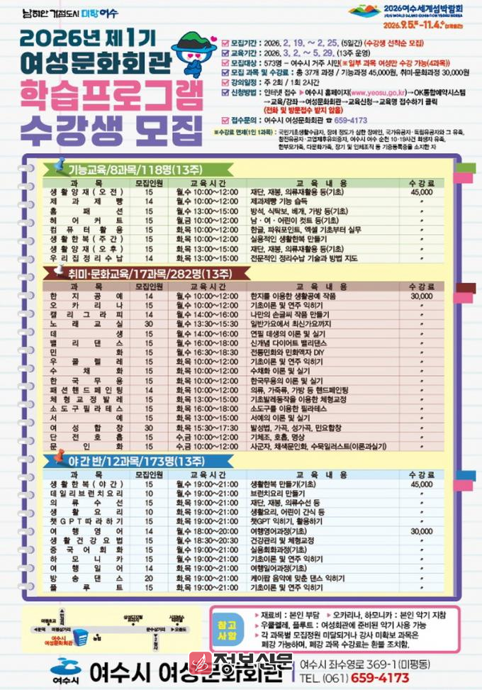 ![]() 여수시 여성문화회관, 제1기 학습프로그램 수강생 모집 |