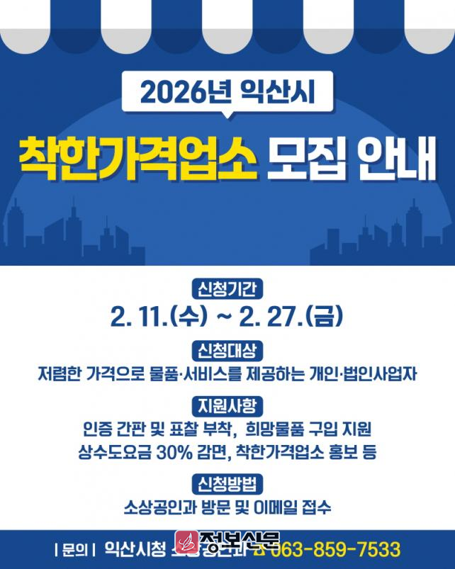 익산시 관계자는 "착한가격업소는 어려운 여건 속에서도 이웃을 위해 착한 마음으로 합리적인 가격을 유지하는 우리 동네의 소중한 이웃"이라며 "신규 업소 발굴과 적극적인 홍보를 통해 서민 경제를 안정시키고 지역 상권에 온기를 불어넣겠다"고 말했다.