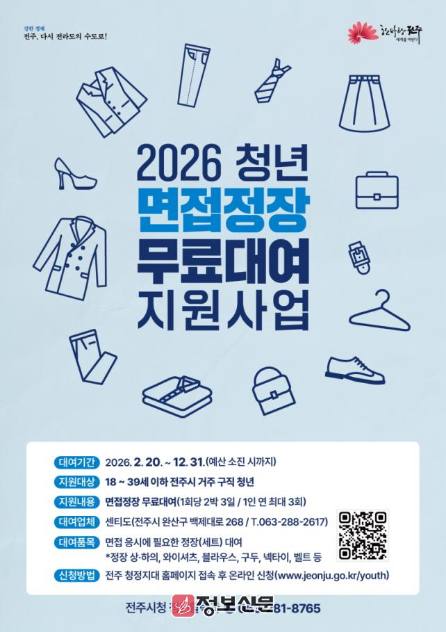 전주시는 오는 20일부터 구직 청년들의 경제적 부담을 덜고 성공적인 면접을 지원하기 위한 ‘2026년 청년 면접정장 무료대여 지원사업’을 본격 추진한다고 19일 밝혔다.