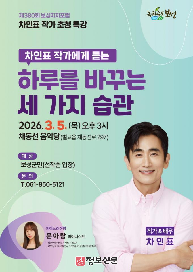한편, 보성자치포럼은 군민과 공직자의 인문학적 소양을 넓히기 위해 꾸준히 운영되고 있는 대표 강연 프로그램으로, 각 분야의 명사들을 초청해 오고 있다. 2026년 올해도 차인표 작가 초청 강연을 시작으로 배움과 소통이 살아 있는 포럼을 이어갈 예정이다.