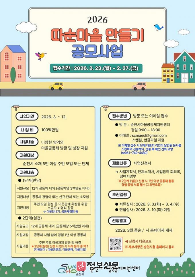 ![]() 순천시, 「2026년 따순마을 만들기 공모사업」 참여자 모집 |