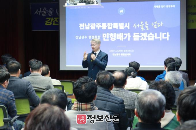 민형배 의원은 이날 장흥문화예술회관 소공연장에서 열린 장흥·강진 경청투어에서 “‘서울을 넘다’라는 것이 저의 의지다. 일거리가 충분하고 생활하는데 편리하고 환경적으로 쾌적한 도시를 만드는 것이 통합특별시의 지향점”이라며 “시민들의 의견을 듣고 통합의 내용을 알차게 채워가겠다”고 밝혔다.