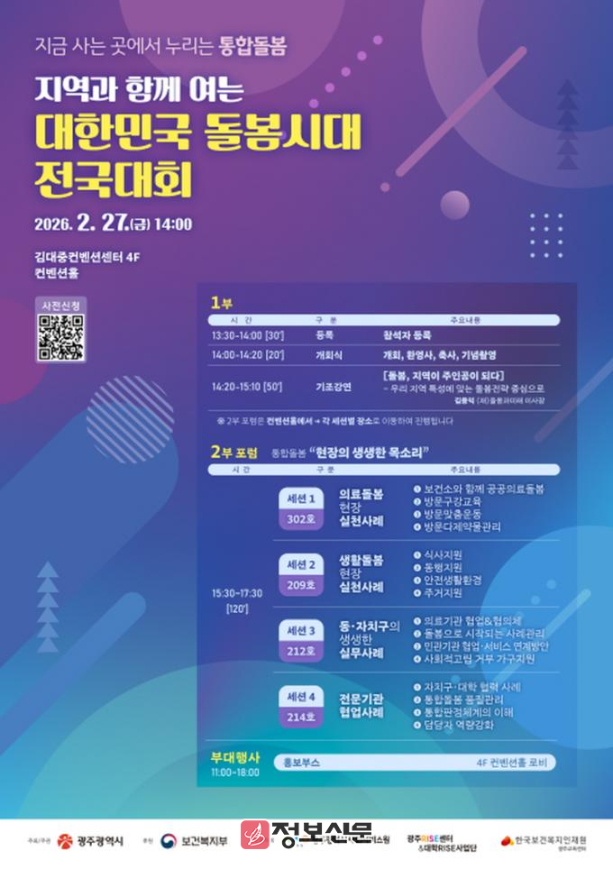 광주광역시(시장 강기정)는 오는 27일 오후 2시 김대중컨벤션센터 4층 컨벤션홀에서 ‘지역과 함께 여는 대한민국 돌봄시대 전국대회’를 개최한다.