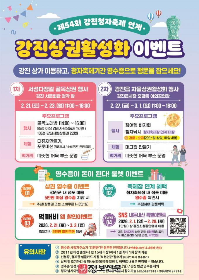 강진원 강진군수는 “청자축제를 찾은 관광객들의 발걸음이 지역 상권으로 이어져 소상공인들에게 실질적인 도움이 되길 바란다”며, “알찬 프로그램이 준비된 만큼, 많은 분이 강진의 맛과 멋을 즐기고 행운의 주인공이 되는 기쁨도 누리시길 바란다”고 말했다.